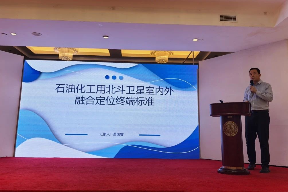 新銳科創(湖北)科技有限公司負責人對牽頭編制的《石油化工用北斗室內外融合定位終端》團體標準進行介紹。