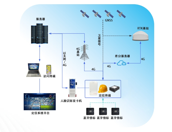 新銳科創的北斗RTK+藍牙+4G人員定位系統結合了北斗衛星導航系統的高精度定位能力、藍牙技術的短距離通信優勢以及4G網絡的實時數據傳輸特性。在煤礦的室外區域,北斗衛星導航系統通過接收衛星信號進行初步定位,而RTK差分基站則通過接收衛星信號并計算出差分信息,進一步提升定位精度至亞米級。在室內區域,由于衛星信號難以穿透訪問墻壁,系統轉而采用藍牙技術進行定位。藍牙信標被布置在室內的關鍵位置,通過廣播藍牙信號與人員攜帶的定位終端(如識別卡)進行通信,實現室內定位。定位數據通過4G網絡實時傳輸至地面控制中心,供管理人員進行監控和調度。