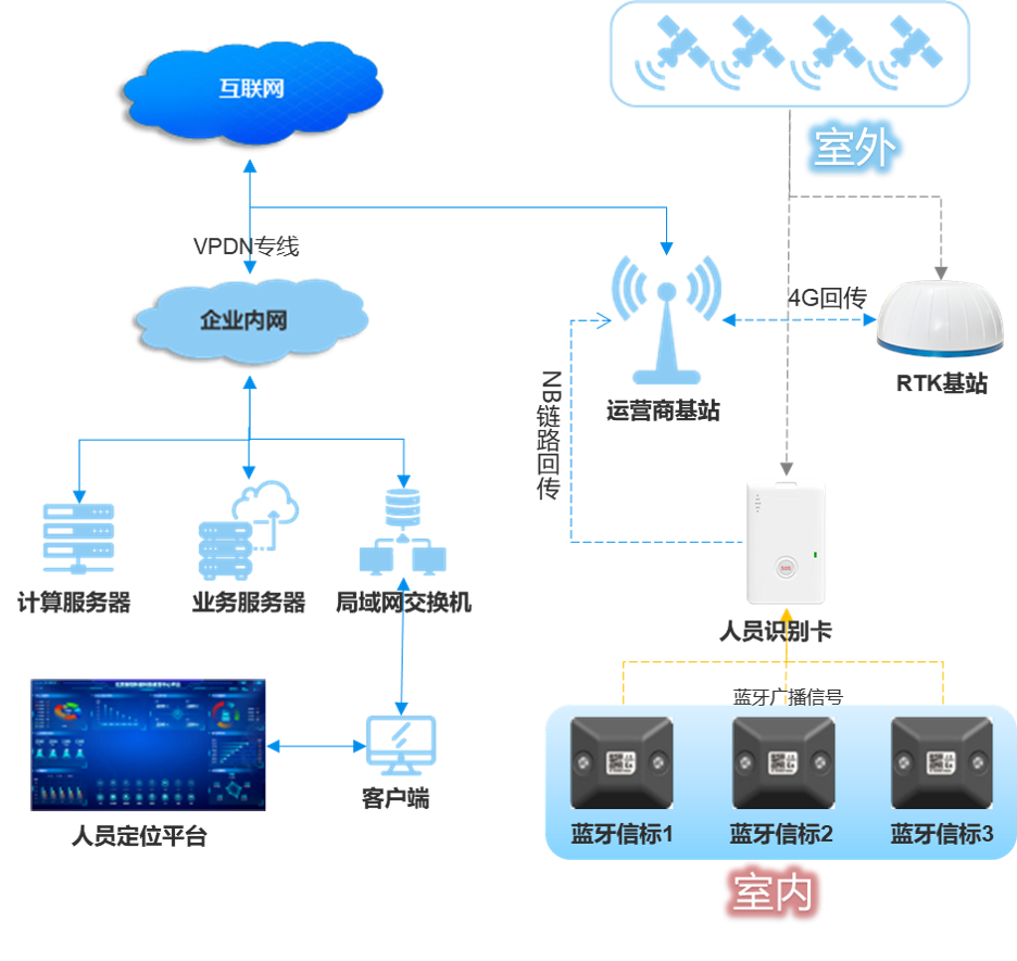 4G+藍(lán)牙+RTK人員定位系統(tǒng)方案拓?fù)鋱D