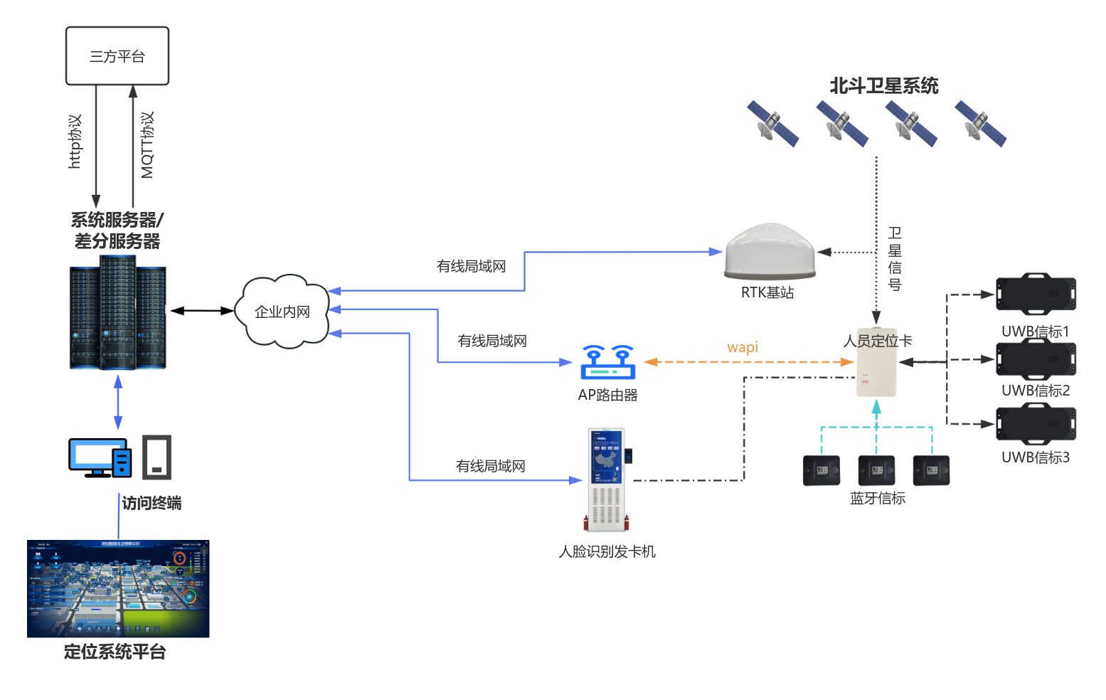 新銳科創WAPI+北斗RTK+藍牙+UWB融合定位系統方案拓撲圖如下: