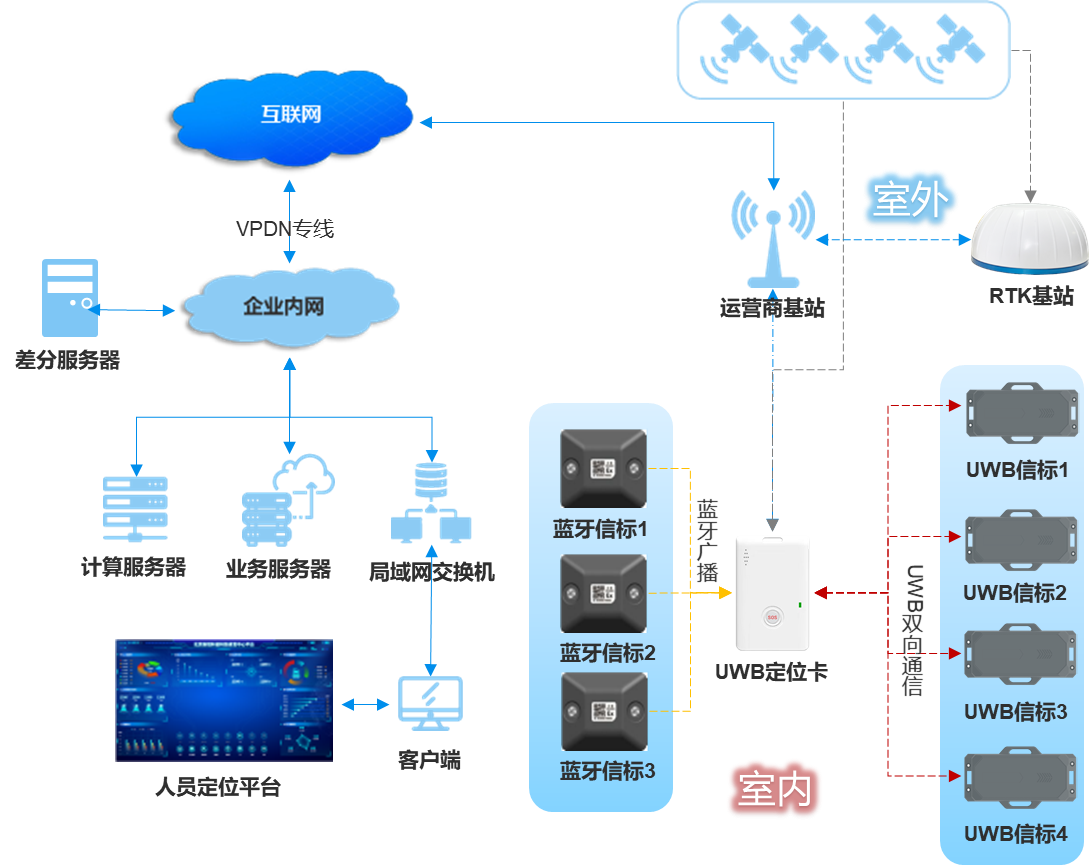 RTK與UWB技術的融合應用,恰好彌補了單一定位技術的短板,形成了室外精準引導、室內無縫銜接的技術優勢。RTK技術依托北斗衛星系統與地面基準站的差分數據處理,在管廊出入口、地面巡檢通道等室外區域可實現高精度定位,為人員設備進出管廊提供精準位置參考。UWB技術則憑借超寬帶信號的高時間分辨率與強抗干擾特性,在管廊內部衛星信號遮擋區域依然能保持亞米級定位精度,完美適配密閉空間的精準管控需求。兩種技術的智能協同,從根本上解決了綜合管廊室內外定位銜接的行業痛點。